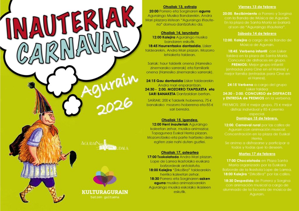 20:00 Porrero eta Sorginaren agurra Aguraingo Musika Bandarekin. Andra Mari plazara iristean “Aguraingo Iñauteria” doinua dantzatuko da.