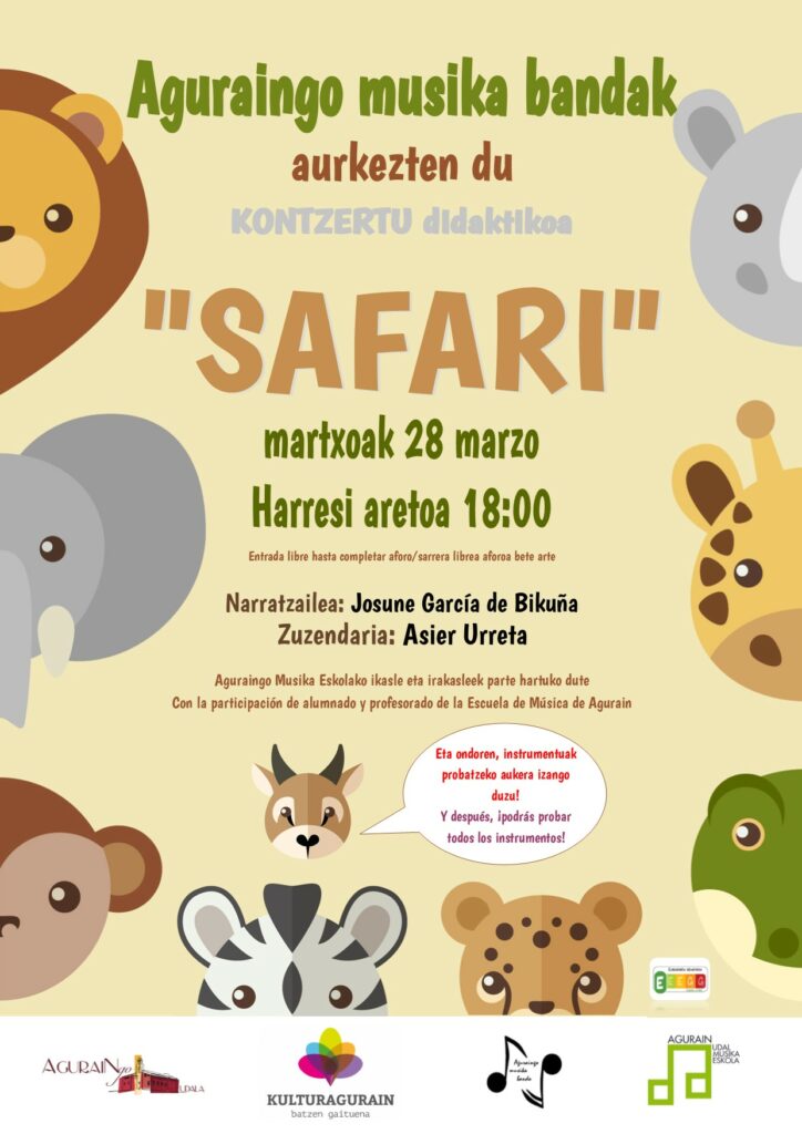 Aguraingo Musika Bandak, Musika Eskolako irakasle eta ikasleekin batera, “SAFARI” izeneko kontzertu pedagogikoa antolatu du. “Safari” narratzailearentzako eta bandarentzako suite sinfoniko bat da, Ferrer Ferranek konposatua, familientzako bidaia musikal hezigarri eta dinamiko gisa diseinatua, non hainbat animalia deskribatzen diren musikaren bidez.